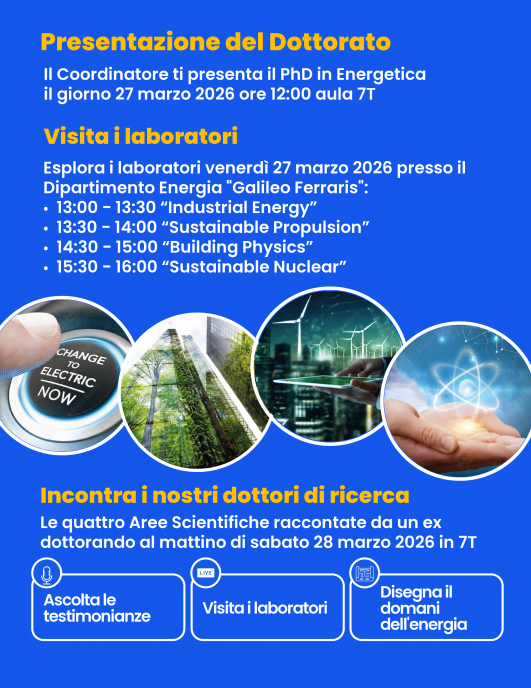 Il Dottorato in Energetica del Politecnico di Torino ti porta al centro dell’innovazione per la transizione energetica. Ricerca avanzata, tecnologie d’avanguardia e un ambiente internazionale ti permetteranno di contribuire a soluzioni sostenibili per il pianeta. Entra in una comunità che trasforma idee in impatto reale e prepara la nuova generazione di esperti energetici.